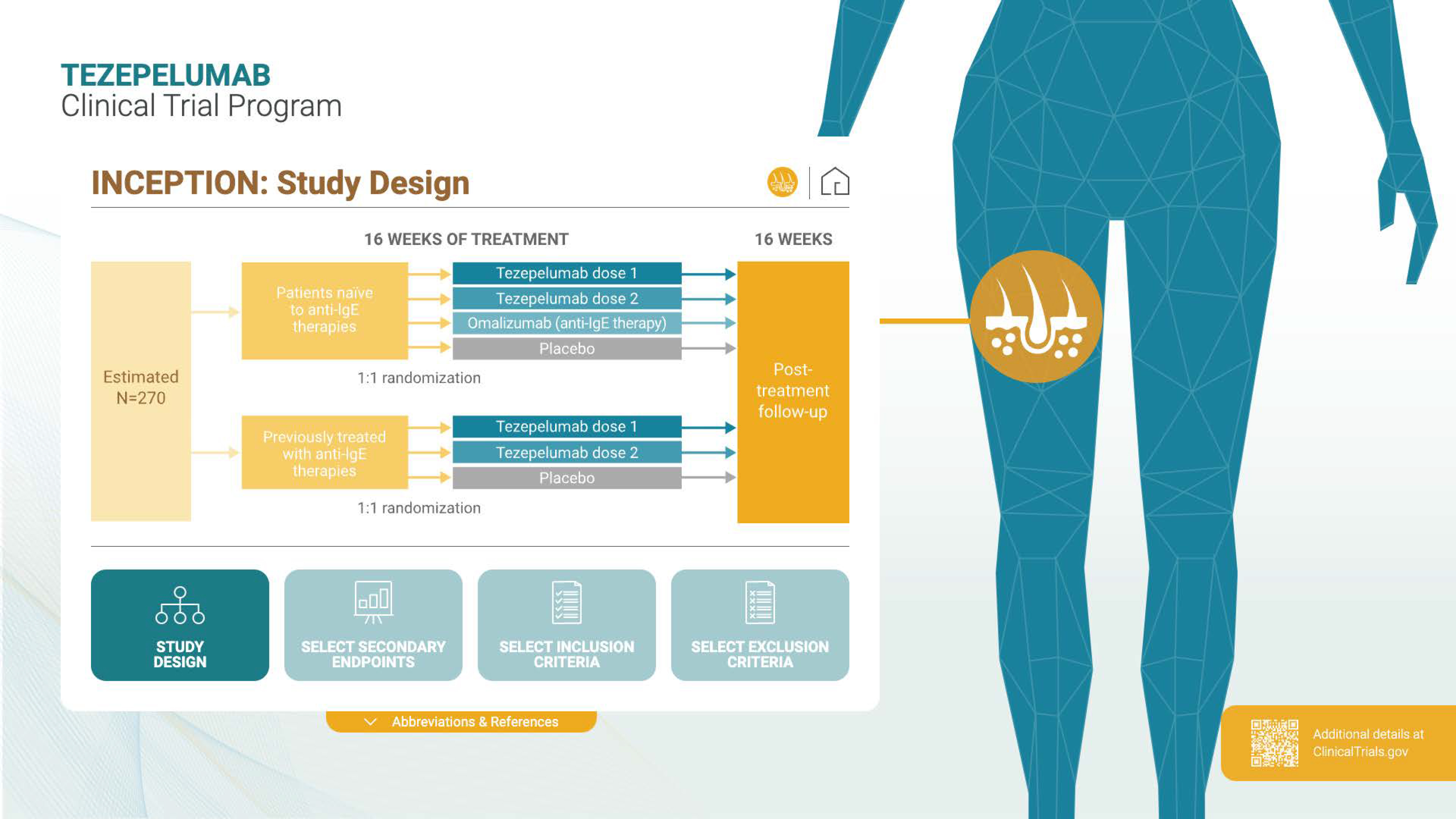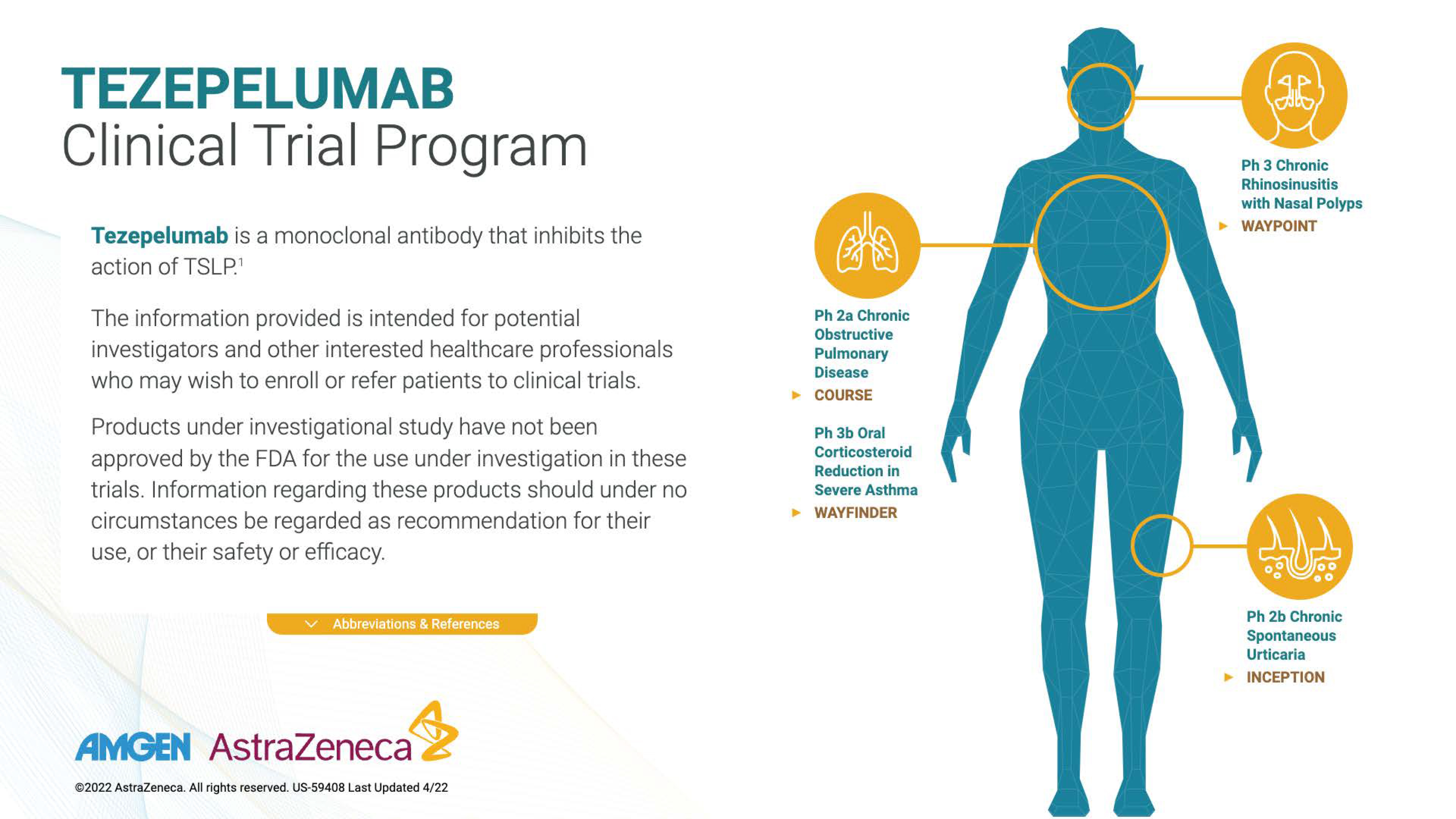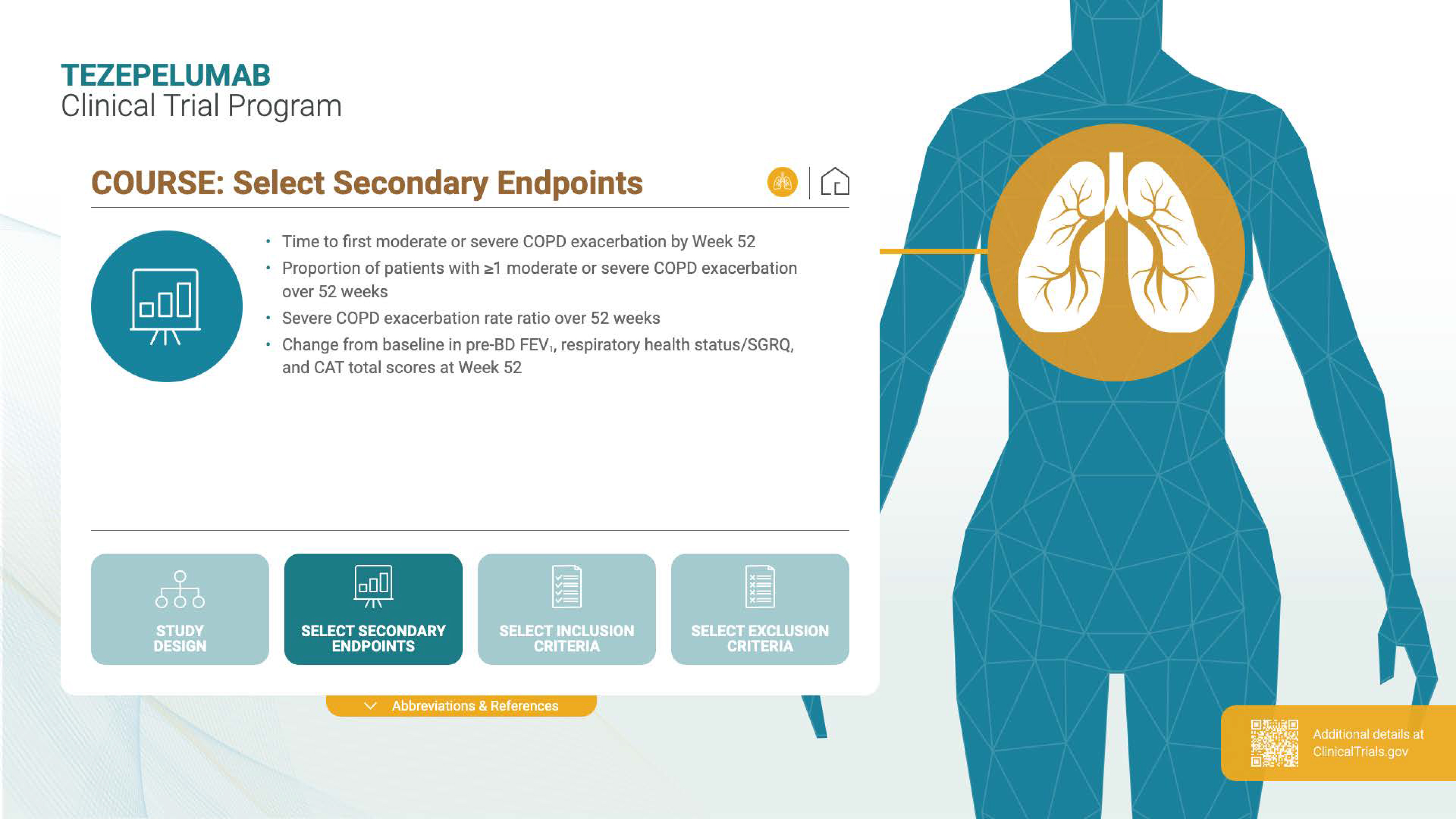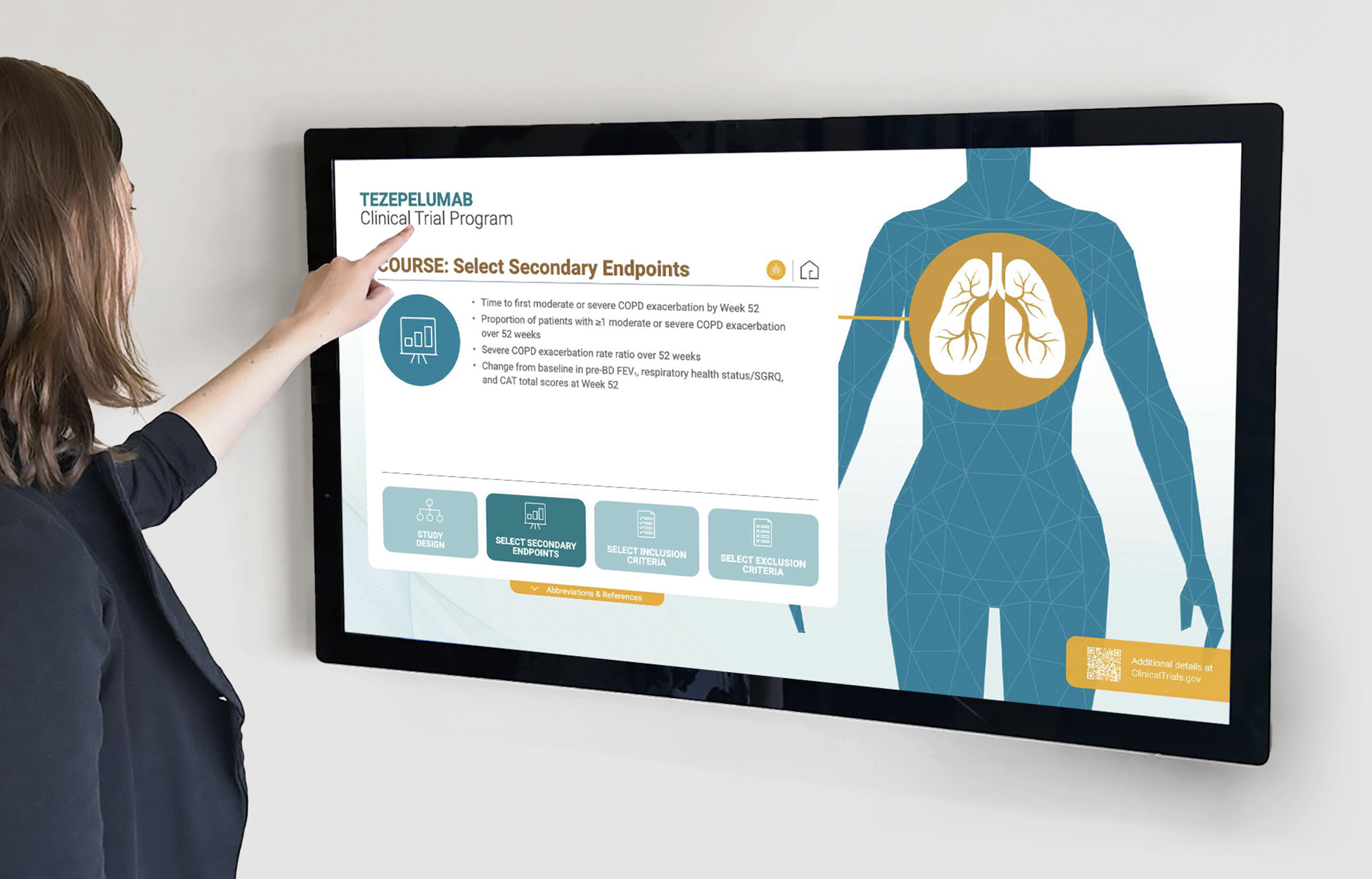 This touchscreen, modular explainer for the tezepelumab clinical trial program was designed for use in settings like conference booths, investigator meetings, or sales/medical education environments, where users may spend seconds or minutes, not long stretches, engaging with the content.