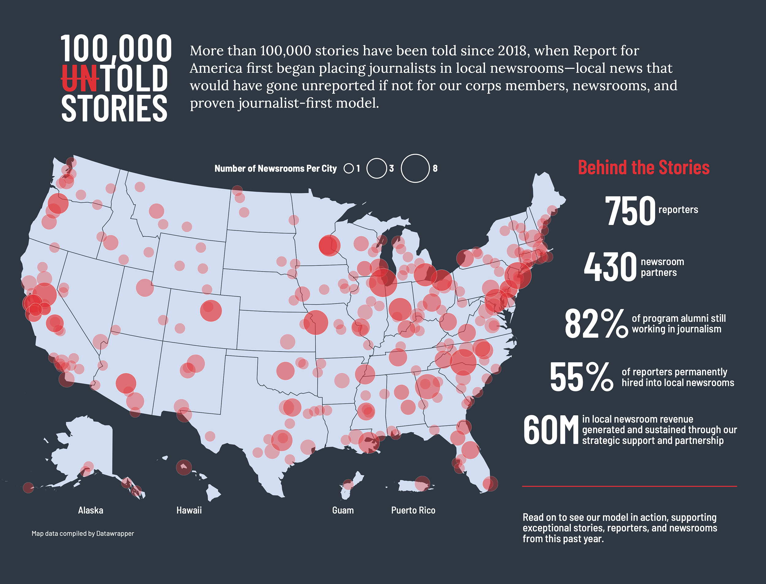 This complex data visualization tells the story of the impact Report For America has had on local newsrooms around the nation. The dataset included hundreds of newsrooms across the country, all of which were compiled using Datawrapper to compose the visualization.