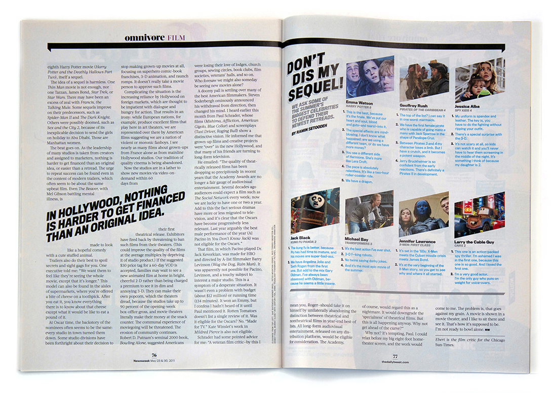 At Newsweek, design in the print edition played an important role in shaping how entertainment, celebrity, and pop culture stories were presented to readers. Working closely with editors and reporters, design helped organize film coverage, celebrity profiles, box office trends, and major cultural moments into clear, visually driven narratives that complemented the reporting.