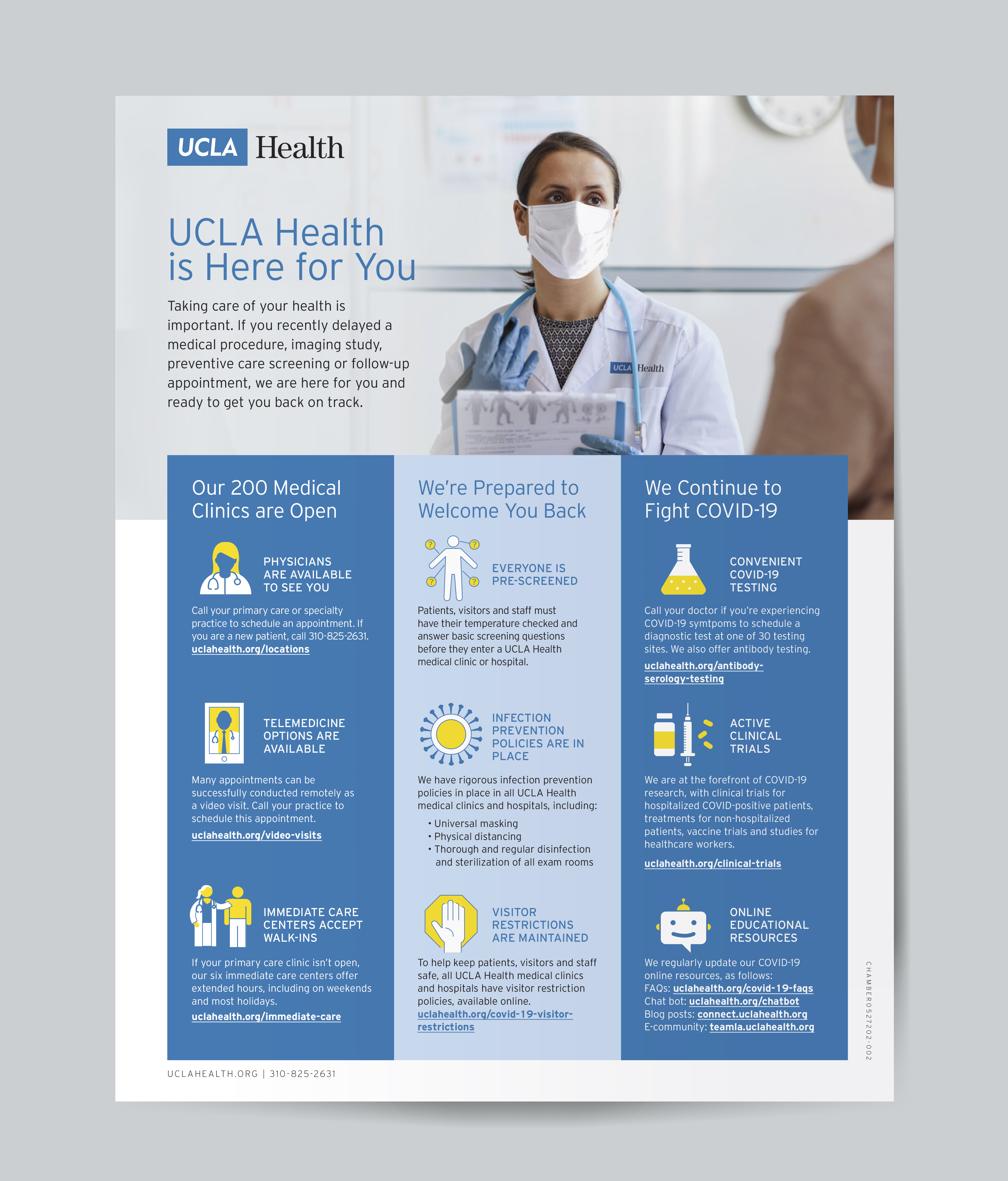 UCLA Health required clear, adaptable visual systems to communicate rapidly evolving medical guidance during COVID-19 and beyond. I partnered with clinical, marketing, and editorial stakeholders to develop scalable design systems spanning digital, print, motion, and presentation platforms, ensuring clarity, credibility, and speed across departments.