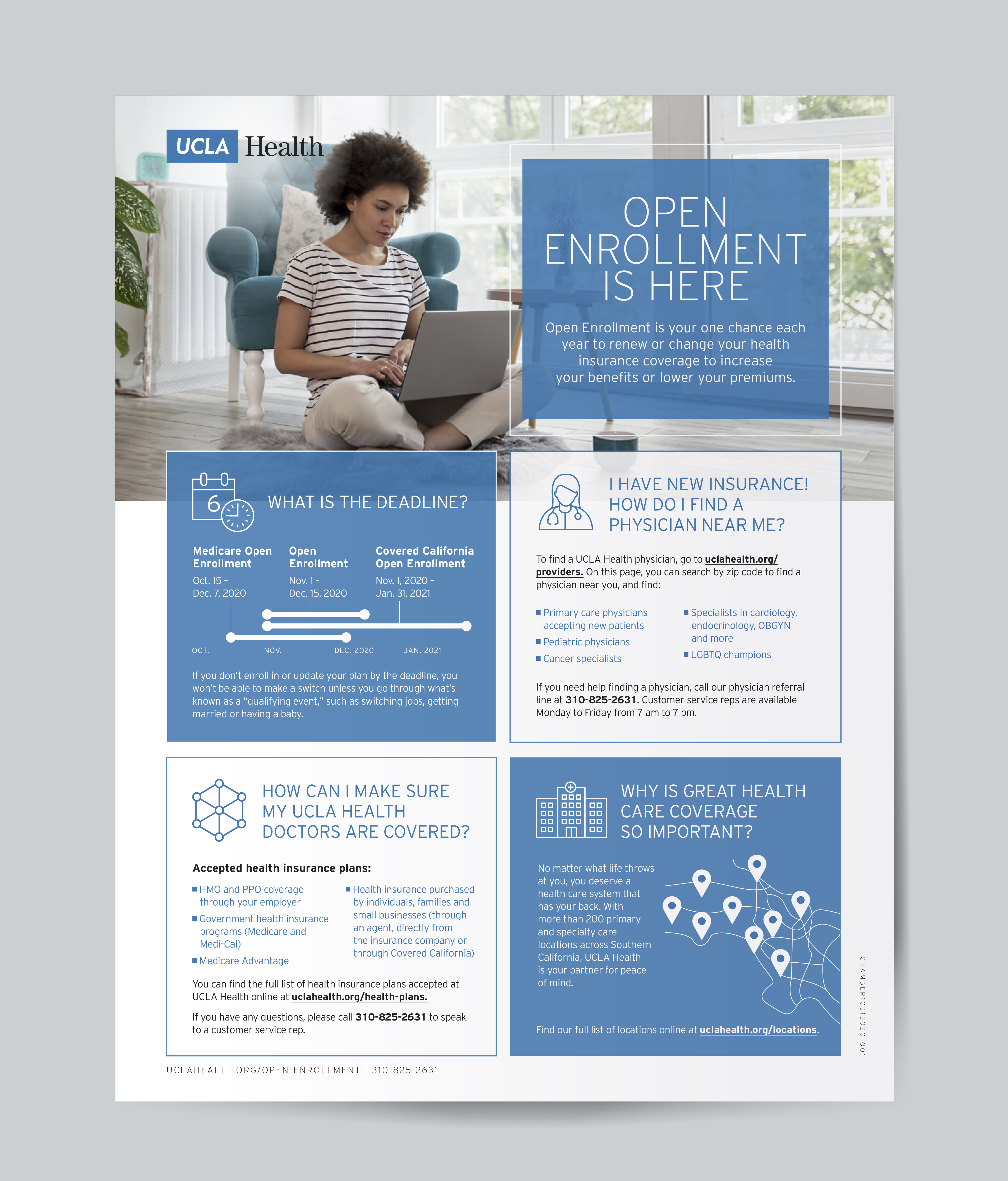 During my time with UCLA Health, I partnered with marketing and clinical stakeholders to translate complex medical information into clear, human-centered design. My work spanned public health campaigns, patient education materials, institutional marketing, and internal communications under tight timelines. The throughline was clarity: distilling dense content into accessible, visually cohesive systems that upheld UCLA Health’s credibility while remaining warm, approachable, and engaging.